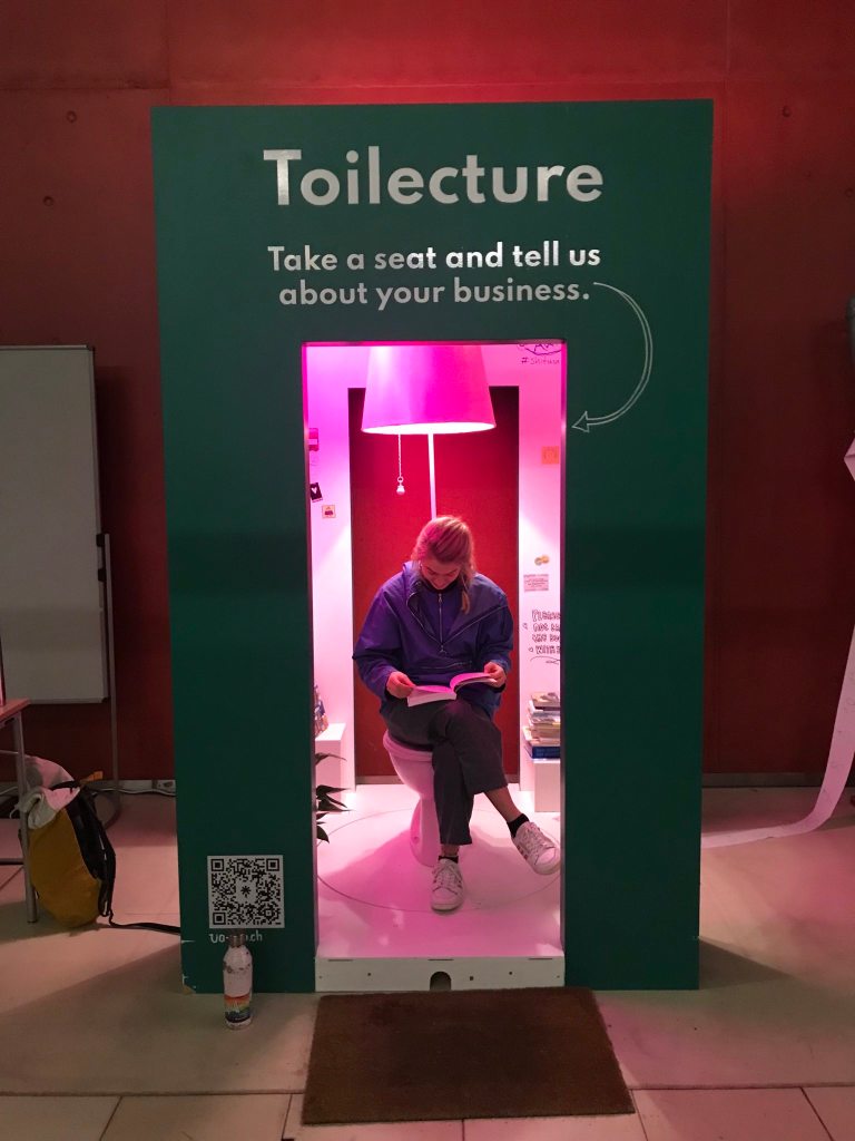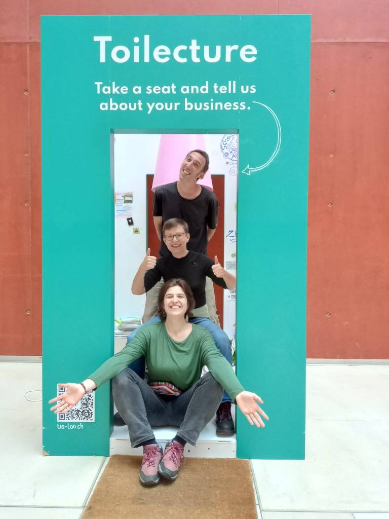 L’altra clara línia de treball és la social: Com sensibilitzar la gent de la importància de la implementació d’aquesta alternativa? En aquest sentit hi ha un munt d’iniciatives, enginys, imatges i jocs de paraules. La xarxa de Suïssa, per exemple, ha construït un vàter rosa dins d’una estructura oberta on pots seure a llegir i informar-te sobre el tema.