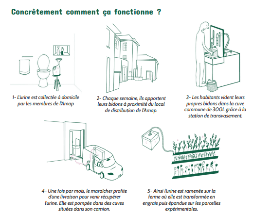Louise Raguet, del grup d’investigació OCAPI de «l’Ecole Nationale des Ponts et Chaussées» de París, ha presentat dos projectes de separació d’orina en edificis que es construiran aviat i un sistema a petita escala que ja està en funcionament en el qual es fa una recol·lecta d’orina de famílies que formen part d’una cooperativa de consum. Un dia la setmana, en anar a buscar la cistella de verdures, deixen la seva orina en un bidó i el pagés se l’emporta al camp per fertilitzar. Aquí teniu uns dibuixos que n’expliquen el funcionament: